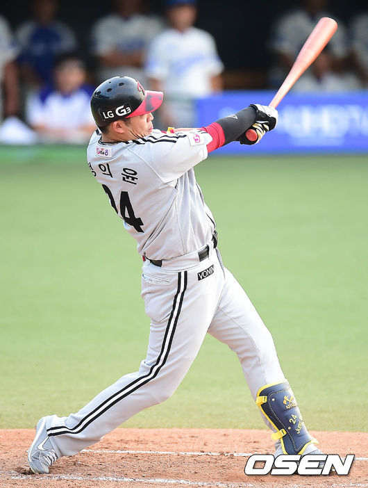 2회초 LG 공격 선두타자로 나선 정의윤이 좌중간을 가르는 2루타를 날리고 있다.
