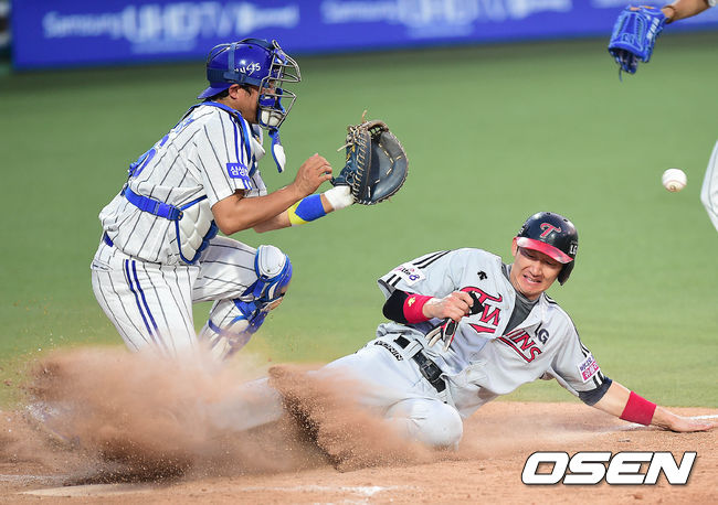 3회초 LG 공격 1사 2루 상황 박용택의 1타점 적시 우전안타 때 2루주자 손주인이 홈까지 내달려 세이프되고 있다.