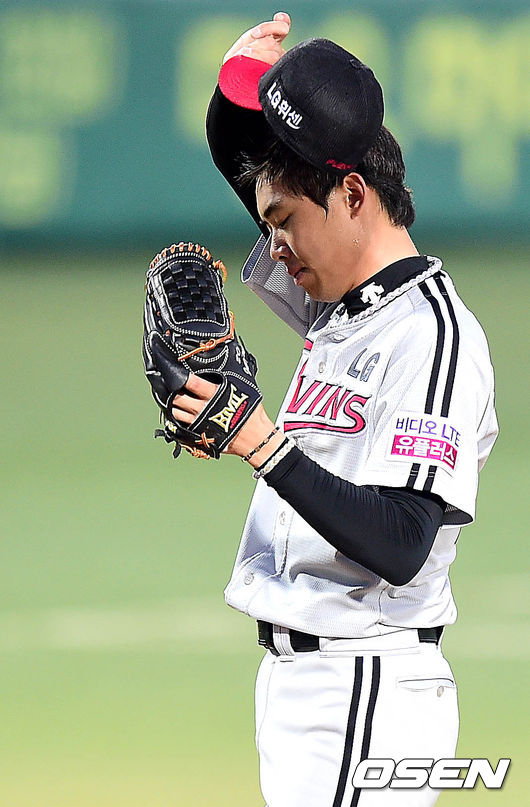 3회말 삼성 공격 무사 1루 상황에서 나바로에게 안타를 허용한 LG 선발 임정우가 모자를 벗으며 아쉬워하고 있다.