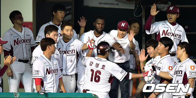 3회말 2사에서 넥센 강정호가 좌월 솔로포를 치고 더그아웃에서 동료들과 환호하고 있다.