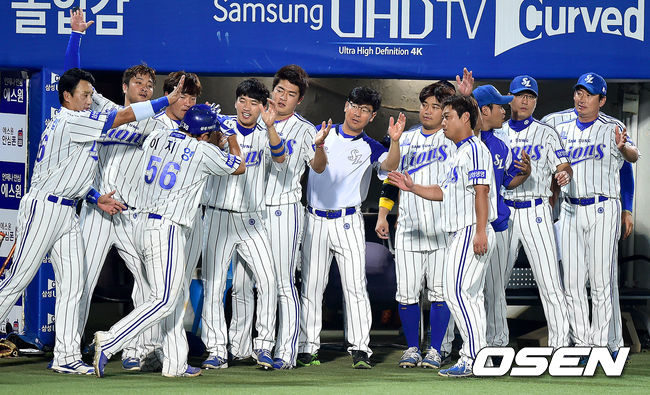 4회말 삼성 공격 1사 주자없는 상황 이지영이 LG 선발 임정우를 상대로 동점 좌월 솔로포를 날리고 홈을 밟은 뒤 더그아웃 동료들과 인사를 나누고 있다.