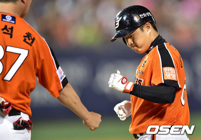 4회초 1사 1,3루에서 한화 이창열이 좌전 적시타를 치고 강석천 코치와 하이파이브를 하고 있다.