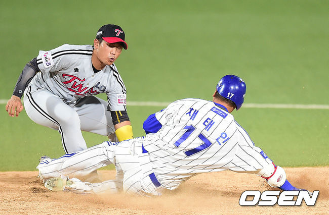 5회말 삼성 공격 1사 주자없는 상황 채태인이 좌중간 안타를 날리고 2루까지 내달렸지만 LG 2루수 박경수의 태그에 걸려 아웃되며 충돌하고 있다.