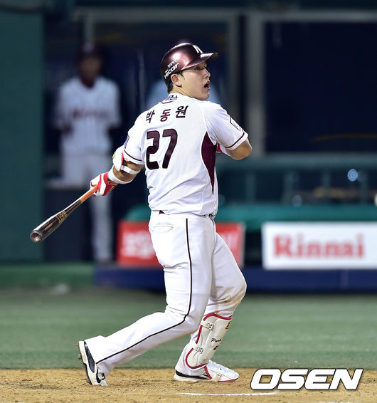 4회말 2사 1,2루에서 넥센 박동원이 우전 적시타를 치고 있다.
