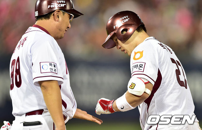4회말 2사 1,2루에서 넥센 박동원이 우전 적시타를 치고 심재학 코치와 하이파이브를 하고 있다.