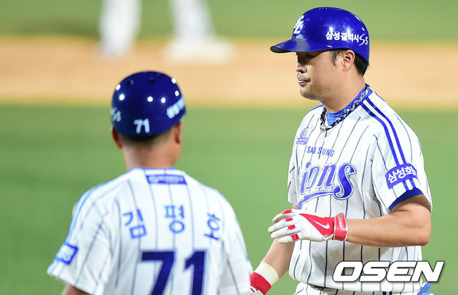 5회말 삼성 공격 2사 1, 3루 상황 박한이가 역전 1타점 중전 적시타를 날리고 1루에 안착하고 있다.