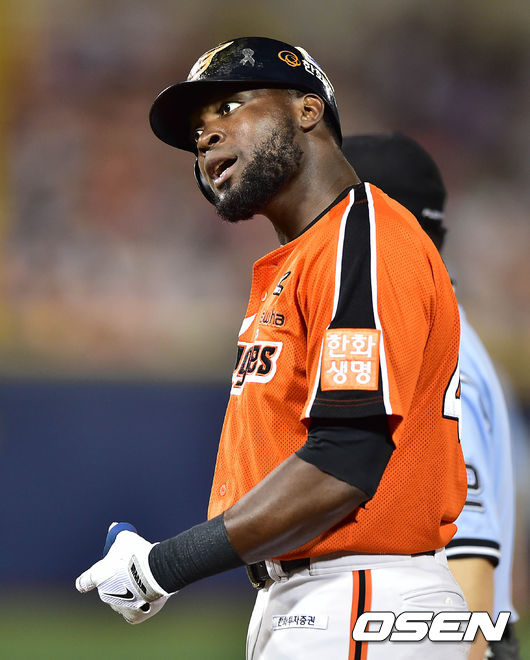 5회초 1사 1루에서 한화 피에가 포스아웃 판정에 강한 불만을 터뜨리고 있다.