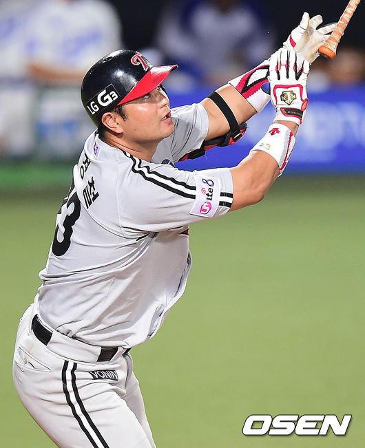 7회초 LG 공격 무사 2, 3루 상황 최경철이 동점 1타점 우익수 희생플라이를 날리고 있다.