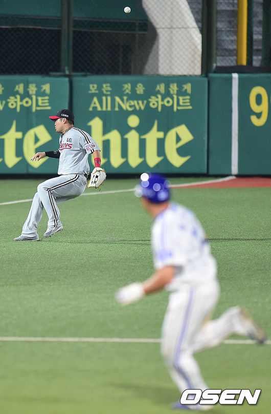 7회말 삼성 공격 2사 1, 2루 상황 대타 김태완의 우익수 앞 동점 2루타가 LG 좌익수 정의윤의 키를 바운드 해 넘어가고 있다.