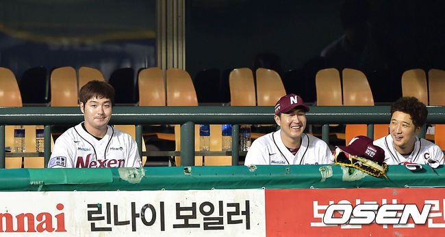 7회말 무사에서 넥센 박병호가 좌월 솔로 홈런을 치고 동료들과 하이파이브 없이 더그아웃에 앉자 유한준과 이택근이 미소를 짓고 있다.