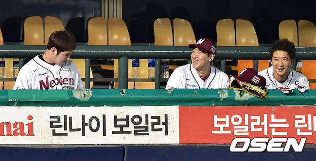 7회말 무사에서 넥센 박병호가 좌월 솔로 홈런을 치고 동료들과 하이파이브 없이 더그아웃에 앉자 유한준과 이택근이 미소를 짓고 있다.