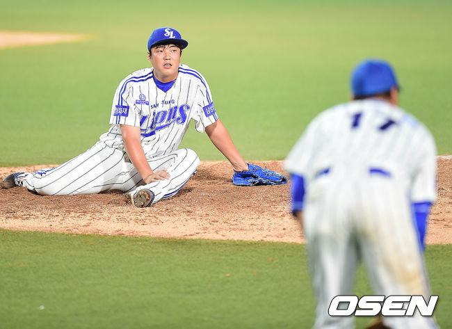7회말 삼성 공격 무사 1, 3루 상황 황목치승의 적시 1타점 투수 강습 내야안타 때 타구에 맞은 삼성 투수 안지만이 그라운드를 바라보고 있다.