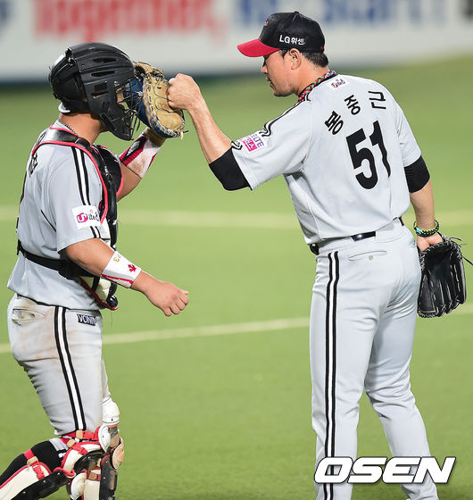 9회말 2사 3루 상황 박한이를 삼진으로 이끌며 경기를 마무리지은 LG 투수 봉중근이 포수 최경철과 인사를 나누고 있다./dreamer@osen.co.kr