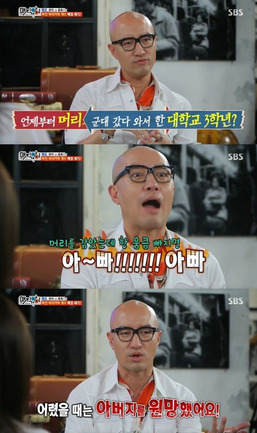 그는 “대학교 3학년 때부터 머리가 빠졌다”며, “우리 아버지가 대머리였다. 그래서 걱정을 많이 했다”고 과거를 떠올렸다. 이어, “별의 별 짓을 다 해 봤지만 소용이 없었다. 머리가 빠지면 ‘아빠!’라고 소리를 치며 원망했다. 그래서 아빠는 항상 미안해 했다”고 말했다.