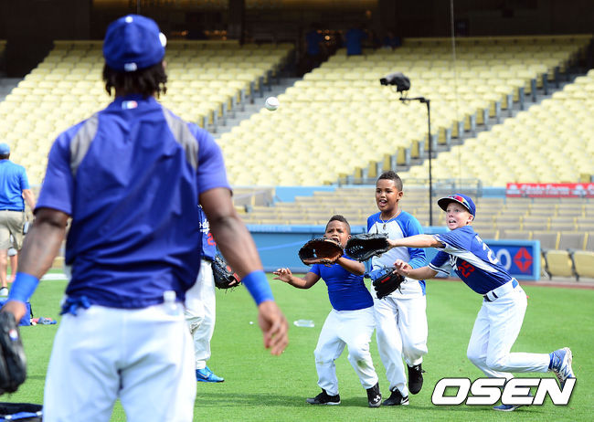 30일(한국시간) 미국 캘리포니아주 로스앤젤레스 다저스타디움에서 열리는 '2014 메이저리그' LA 다저스와 애틀란타 브레이브스의 경기에 앞서 다저스 라미레즈가 자신의 아들과 캐치볼을 하고 있다.