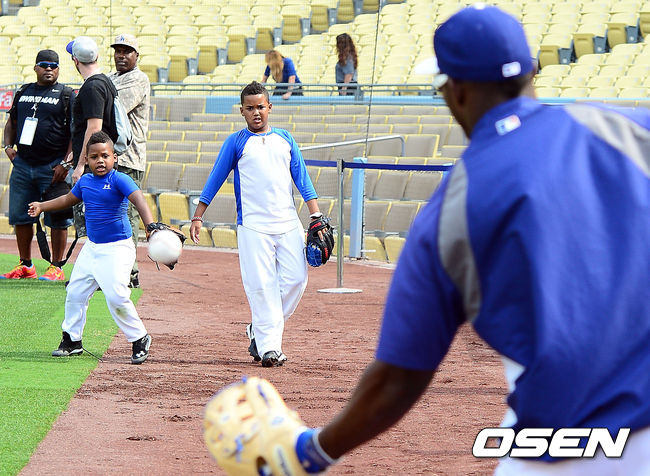 30일(한국시간) 미국 캘리포니아주 로스앤젤레스 다저스타디움에서 열리는 '2014 메이저리그' LA 다저스와 애틀란타 브레이브스의 경기에 앞서 다저스 푸이그가 라미레즈의 아이들과 캐치볼을 하고 있다.
