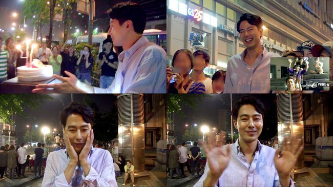 이윽고 서프라이즈 이벤트라는 이야기와 함께 "야외에 설치된 스크린을 주목하라"는 스태프의 말에 어리둥절해진 조인성 앞에는 스태프들의 조금은 어설프지만 진심이 담긴 생일 축하 모습들이 등장했다.