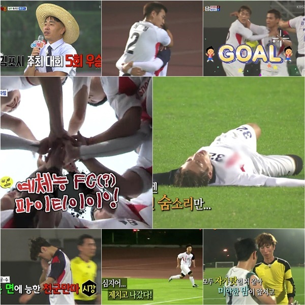 지난 29일 방송된 KBS 2TV 예능프로그램 '우리동네 예체능'(이하 '예체능')은 브라질에서 귀국한 이영표와 조우종이 우리동네 FC에 복귀한 가운데, 11:11의 정식 경기로 연기자 이시강, 가수 원준, 개그맨 양상국이 새로운 멤버로 투입돼 농부들로 이뤄진 풍년 FC와 한판 대결을 펼쳤다.