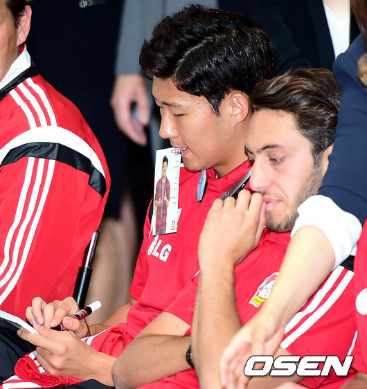 30일 오전 서울 여의도 IFC몰에서 열린'바이엘04레버쿠젠 손흥민과 Better Life'행사에서 축구선수 손흥민이 엽서에 사인을 하고 있다.