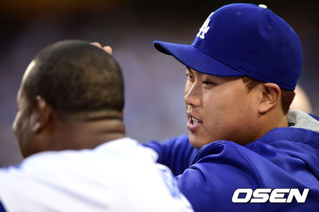 다저스 류현진이 유리베와 이야기를 나누고 있다.