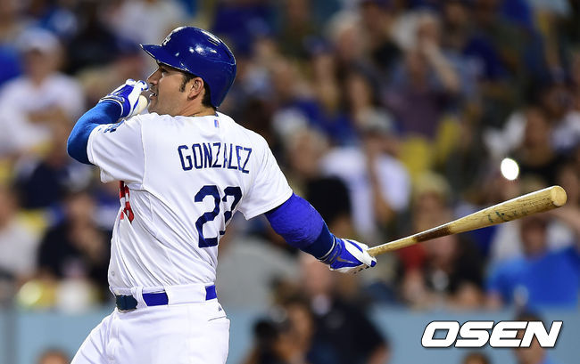 5회말 1사 3루 다저스 곤잘레스가 1타점 적시 2루타를 날리고 있다.