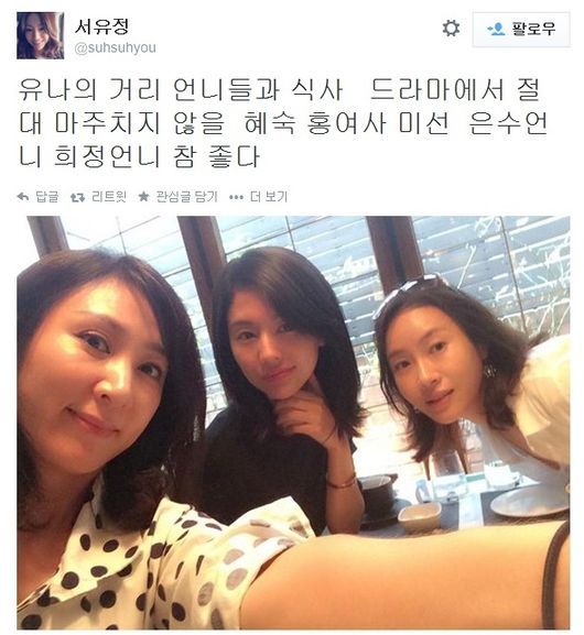 서유정은 지난 29일 자신의 트위터에 “유나의 거리 언니들과 식사 드라마에서 절대 마주치지 않을 혜숙 홍여사 미선 은수언니 희정언니 참 좋다”라는 글과 사진을 게재했다.