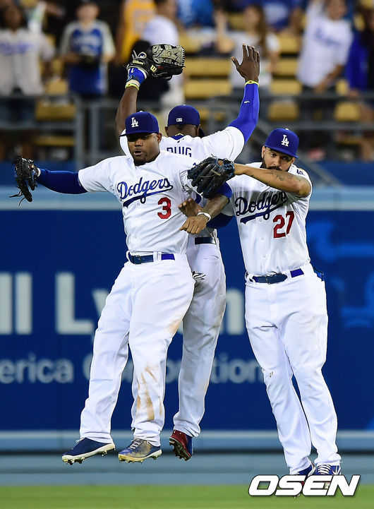 승리 거둔 다저스 크로포드, 켐프, 푸이그가 세레머니를 하고 있다./youngrae@osen.co.kr