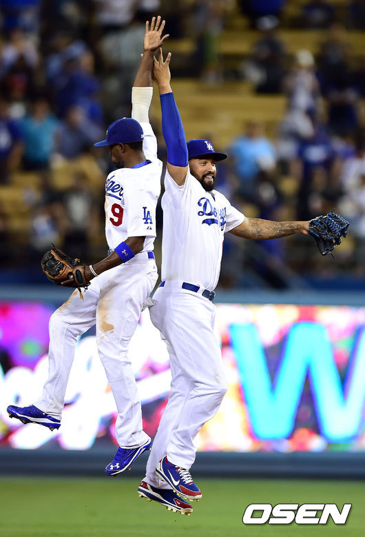 승리 거둔 다저스 디 고든과 맷 켐프가 세레머니를 하고 있다./youngrae@osen.co.kr