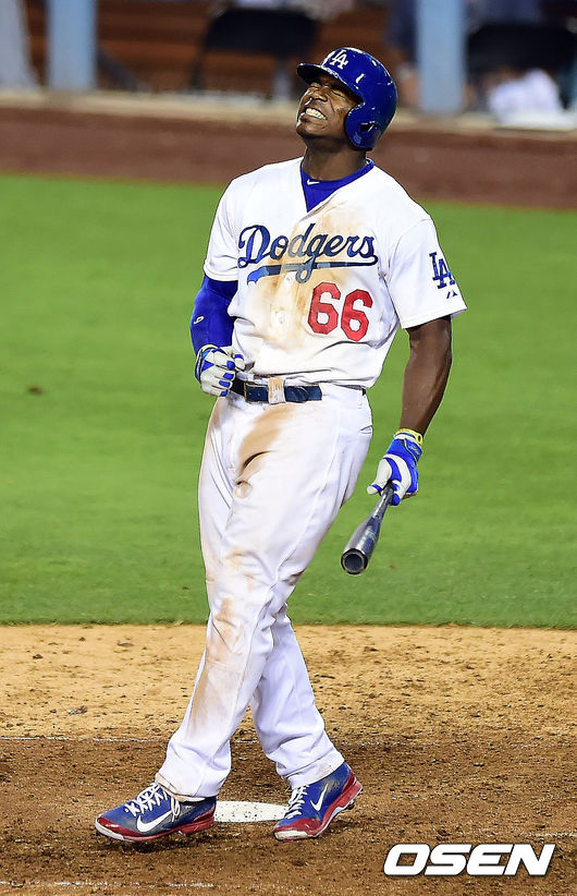 8회말 1사 2루 다저스 푸이그가 삼진을 당한 뒤 아쉬워하고 있다./youngrae@osen.co.kr