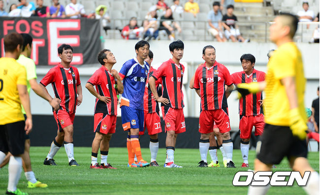 30일 오후 서울월드컵경기장에서 열린 FC 서울 올드스타와 KBS 예능 프로그램 '우리동네 예체능'팀의 경기, 경기에 앞서 FC서울 올드스타 선수들이 경기를 준비하고 있다.