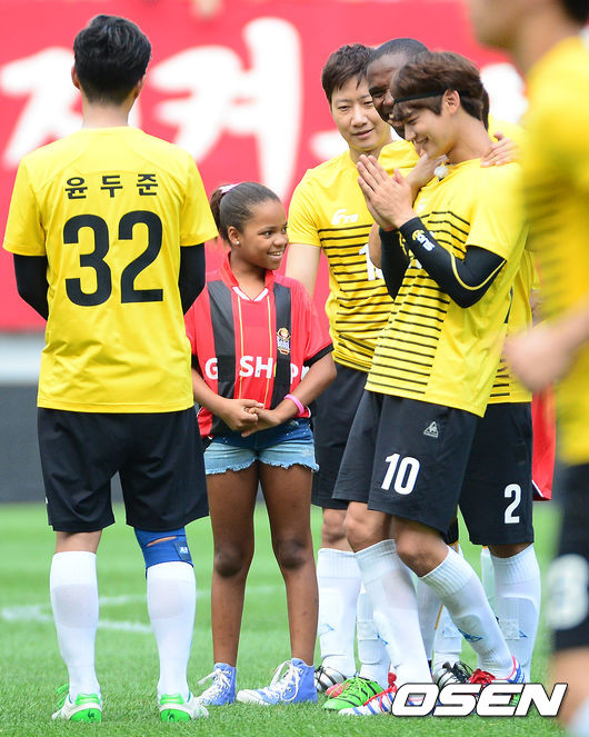 30일 오후 서울월드컵경기장에서 열린 FC 서울 올드스타와 KBS 예능 프로그램 '우리동네 예체능'팀의 경기, 경기에 앞서 FC서울 아디 코치의 딸이 윤두준, 최민호와 즐거운 시간을 보내고 있다.