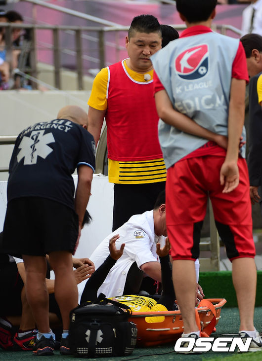 30일 오후 서울월드컵경기장에서 열린 FC 서울 올드스타와 KBS 예능 프로그램 '우리동네 예체능'팀의 경기 전반 이기광이 부상으로 들것에 실려 나오자 강호동이 걱정스러운 눈빛으로 바라보고 있다.