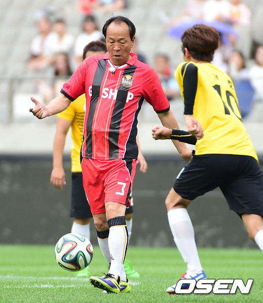 30일 오후 서울월드컵경기장에서 열린 FC 서울 올드스타와 KBS 예능 프로그램 '우리동네 예체능'팀의 경기 전반 한문배가 볼을 다루고 있다.