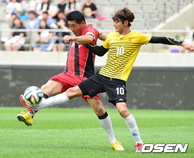 30일 오후 서울월드컵경기장에서 열린 FC 서울 올드스타와 KBS 예능 프로그램 '우리동네 예체능'팀의 경기 후반 샤이니 민호가 볼다툼을 하고 있다.