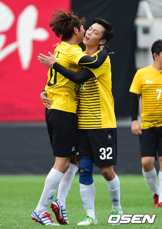 30일 오후 서울월드컵경기장에서 열린 FC 서울 올드스타와 KBS 예능 프로그램 '우리동네 예체능'팀의 경기 후반 민호가 골을 넣고 윤두준과 포옹을 하고 있다.