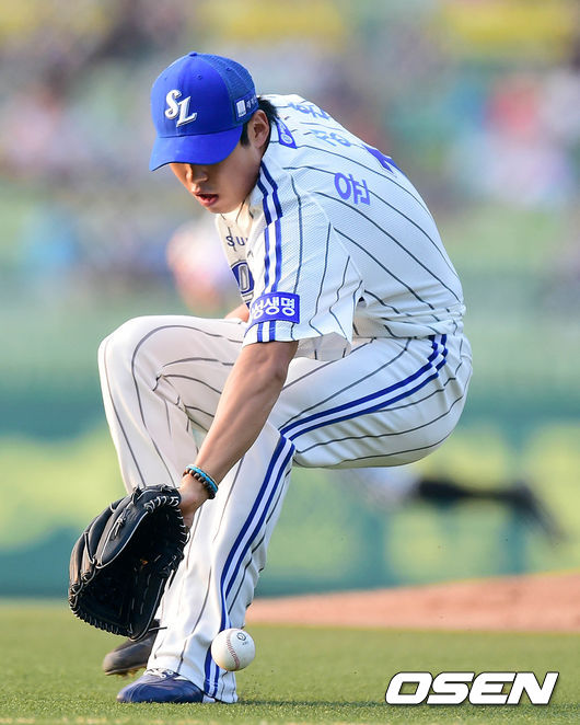 1회초 LG 공격 무사 1루 상황 손주인의 내야 번트 안타를 삼성 선발 윤성환이 처리하고 있다. 타자주자 1루에서 세이프.