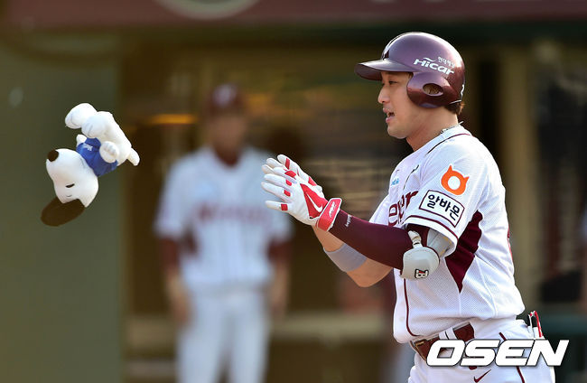 1회말 무사 1루에서 넥센 이택근이 좌월 투런 홈런을 치고 홈에서 홈런 인형을 받고 있다.