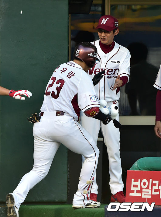 2회말 1사에서 넥센 문우람이 중월 솔로 홈런을 치고 더그아웃에서 염경엽 감독과 하이파이브를 하고 있다.