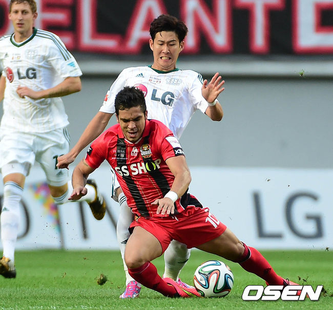 30일 오후 서울월드컵경기장에서 열린 FC 서울과 바이엘 04 레버쿠젠의 경기 전반 손흥민과 에벨톤이 볼경합을 벌이고 있다.