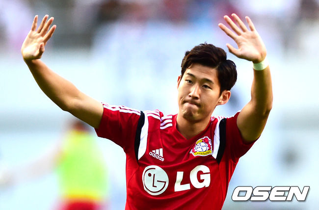 30일 오후 서울월드컵경기장에서 열린 'LG전자 초청 바이엘 04 레버쿠젠 한국투어 2014' FC서울과 레버쿠젠의 경기, 경기에 앞서 손흥민이 팬들에 인사를 하고 있다.