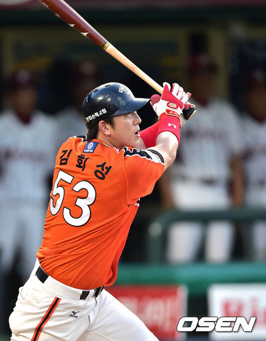 4월까지 홈런 4개를 터뜨리며 거포 본능을 과시한 김회성은 그러나 5월7일 시즌 5호 홈런을 끝으로 좀처럼 홈런이 나오지 않았다. 6월말에는 등에 담 증세를 보이며 2군에 내려가기도 했다. 지난 25일 1군에 복귀한 그는 모처럼 홈런 손맛을 보며 존재감을 알렸다. 맞는 순간만 하더라도 담장을 넘길 것 같지 않았지만 타구가 라인드라이브로 뻗어 중앙 담장 밖으로 날아갔다.