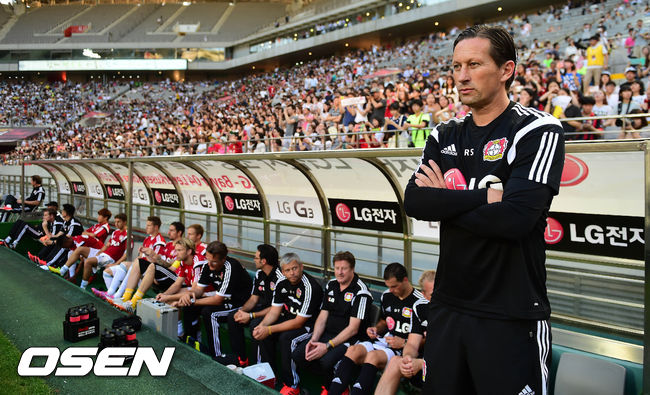30일 오후 서울월드컵경기장에서 열린 FC 서울과 바이엘 04 레버쿠젠의 경기 시작전 레버쿠젠 로저 슈미트 감독이 벤치 앞에 서 있다.