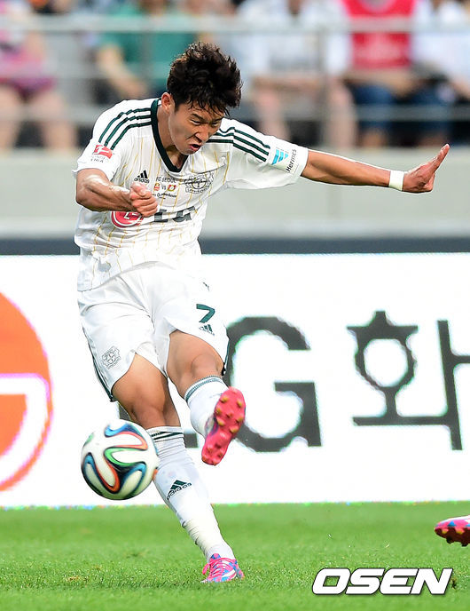 30일 오후 서울월드컵경기장에서 열린 'LG전자 초청 바이엘 04 레버쿠젠 한국투어 2014' FC서울과 레버쿠젠의 경기, 전반 레버쿠젠 손흥민이 중거리슛을 시도하고 있다.
