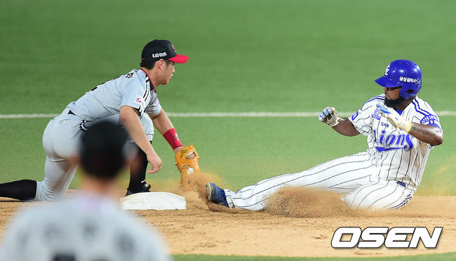 2회말 삼성 공격 무사 1루 상황 박해민의 중견수 플라이 때 나바로가 태그업해 2루에 세이프되고 있다.