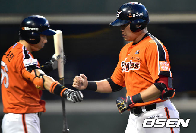 4회초 무사에서 한화 최진행이 우월 솔로 홈런을 날리고 고동진과 하이파이브를 하고 있다.