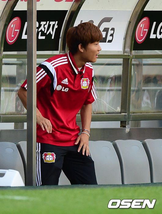 30일 오후 서울월드컵경기장에서 열린 'LG전자 초청 바이엘 04 레버쿠젠 한국투어 2014' FC서울과 레버쿠젠의 경기, 경기에 앞서 레버쿠젠 류승우가 벤치에서 동료선수들의 훈련을 지켜보고 있다.