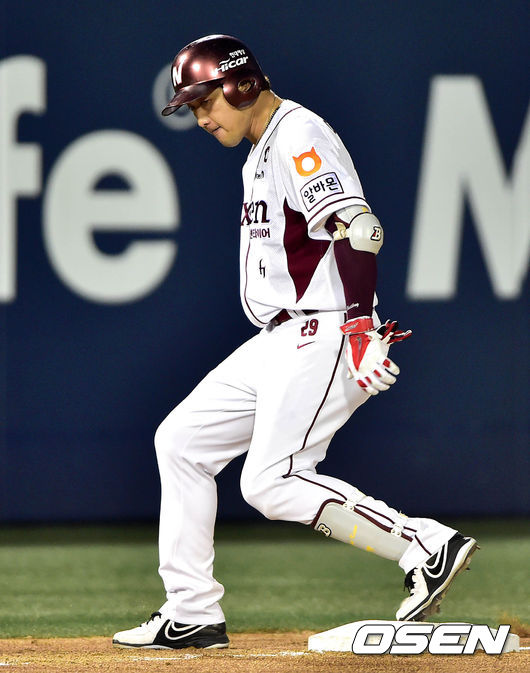 4회말 1사 2루에서 넥센 이택근이 우중간 적시 3루타를 치고 환호하고 있다.