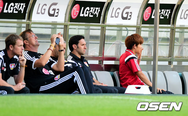 30일 오후 서울월드컵경기장에서 열린 'LG전자 초청 바이엘 04 레버쿠젠 한국투어 2014' FC서울과 레버쿠젠의 경기, 경기에 앞서 레버쿠젠 류승우가 벤치에서 동료선수들의 훈련을 지켜보고 있다.