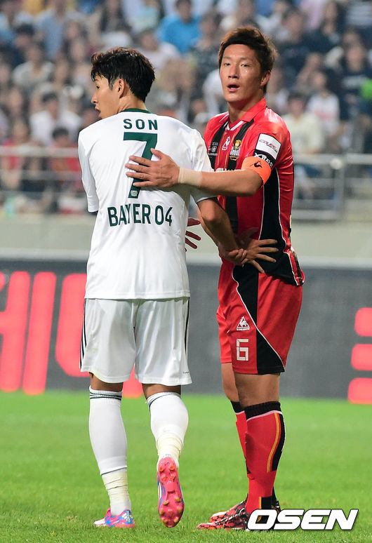 30일 오후 서울월드컵경기장에서 열린 FC 서울과 바이엘 04 레버쿠젠의 경기 후반 김진규와 손흥민이 서로를 격려하고 있다.