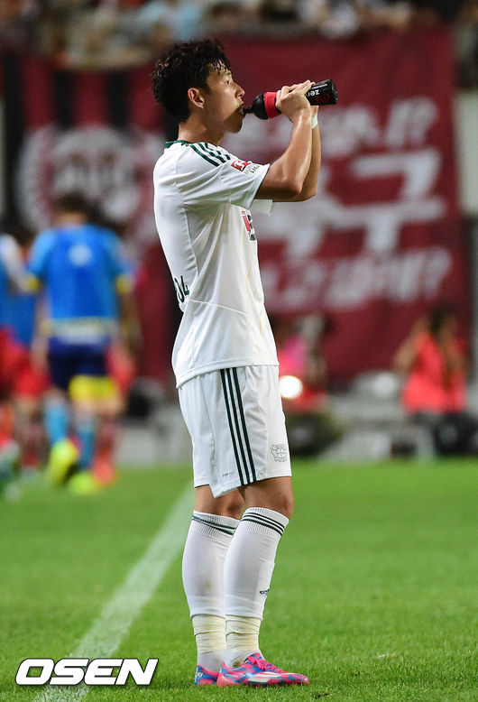 30일 오후 서울월드컵경기장에서 열린 FC 서울과 바이엘 04 레버쿠젠의 경기 후반 손흥민이 음료를 마시고 있다.